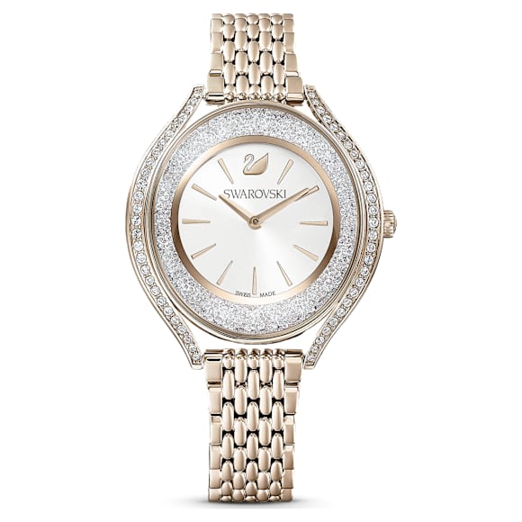Eminently elegant: This Swarovski watch from our Crystalline Aura Collection artfully combines form and function. More than 1,300 crystals in the champagne-gold tone PVD case create a brilliant sparkling effect. A champagne-gold tone PVD bracelet and a white silver tone dial with the Swarovski swan at 12 o'clock complete the sophisticated design. This Swiss made watch is water resistant up...