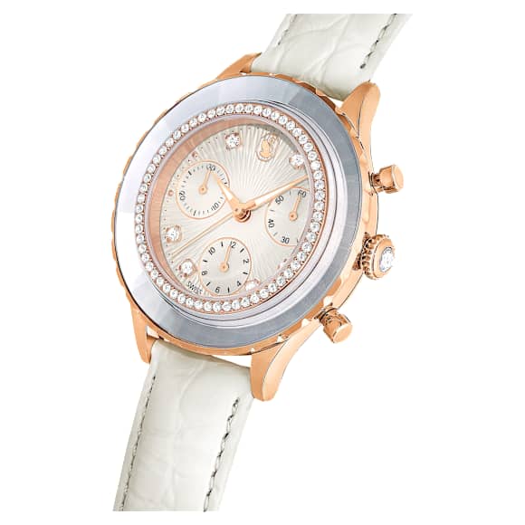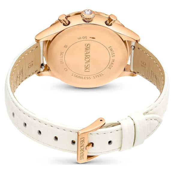 This ivory-colored chronograph watch delivers a perfect fusion of watchmaking expertise and Swarovski savoir-faire. The round 37mm case is made with a rose gold-tone finish and features a signature crystallized bezel, which is neatly faceted and accompanied by a circle of clear pavé. Beneath the mineral glass, the guilloché dial features a swan logo at 12 o’clock, LumiNova coated hands,...
