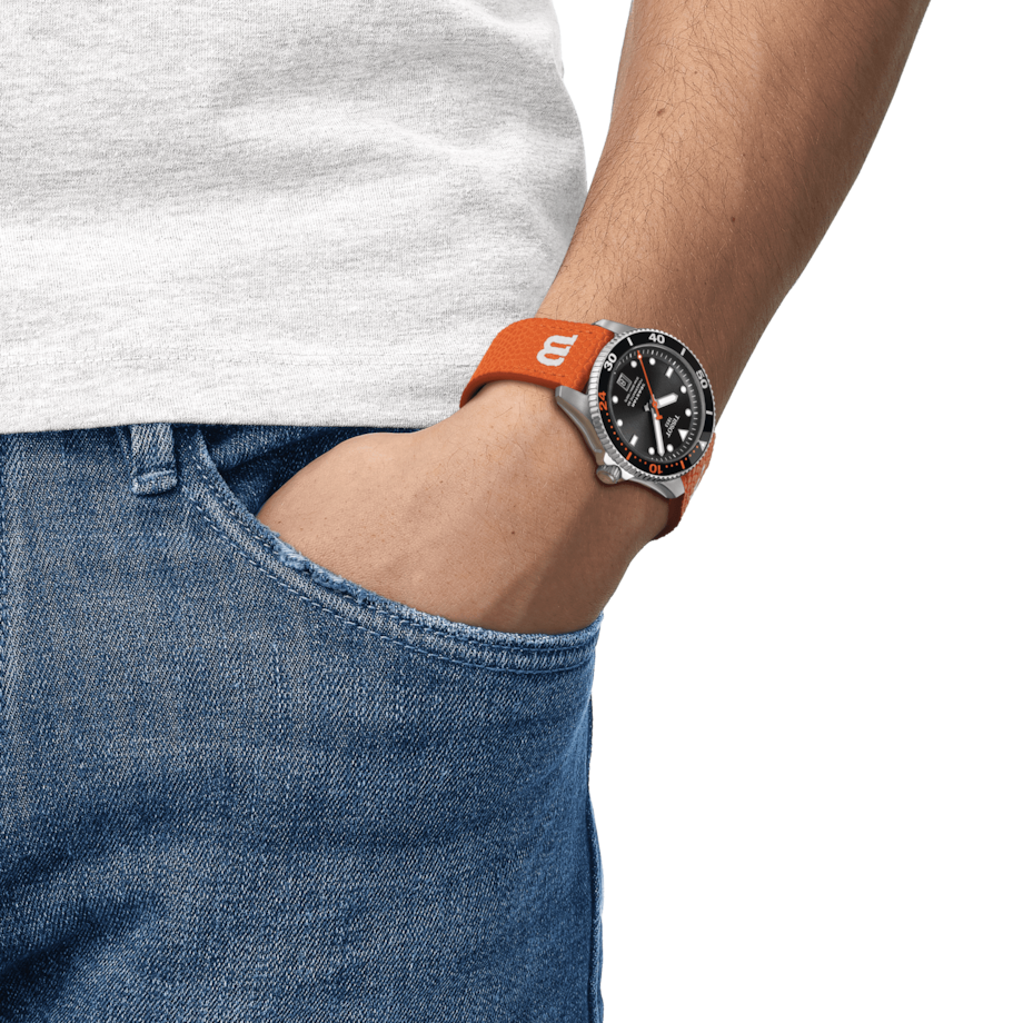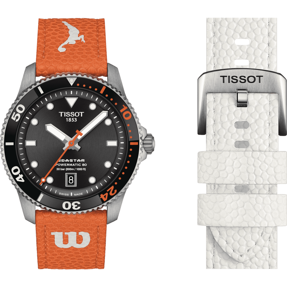The Tissot Seastar 1000 Wilson WNBA watch is a special edition timepiece designed to celebrate the partnership between Tissot and the Women's National Basketball Association (WNBA). This new edition is powered by a high-quality Swiss Made quartz movement, known for its precision and reliability. This model is accentuated by white and orange details, mirroring the WNBA’s colors. It features a...