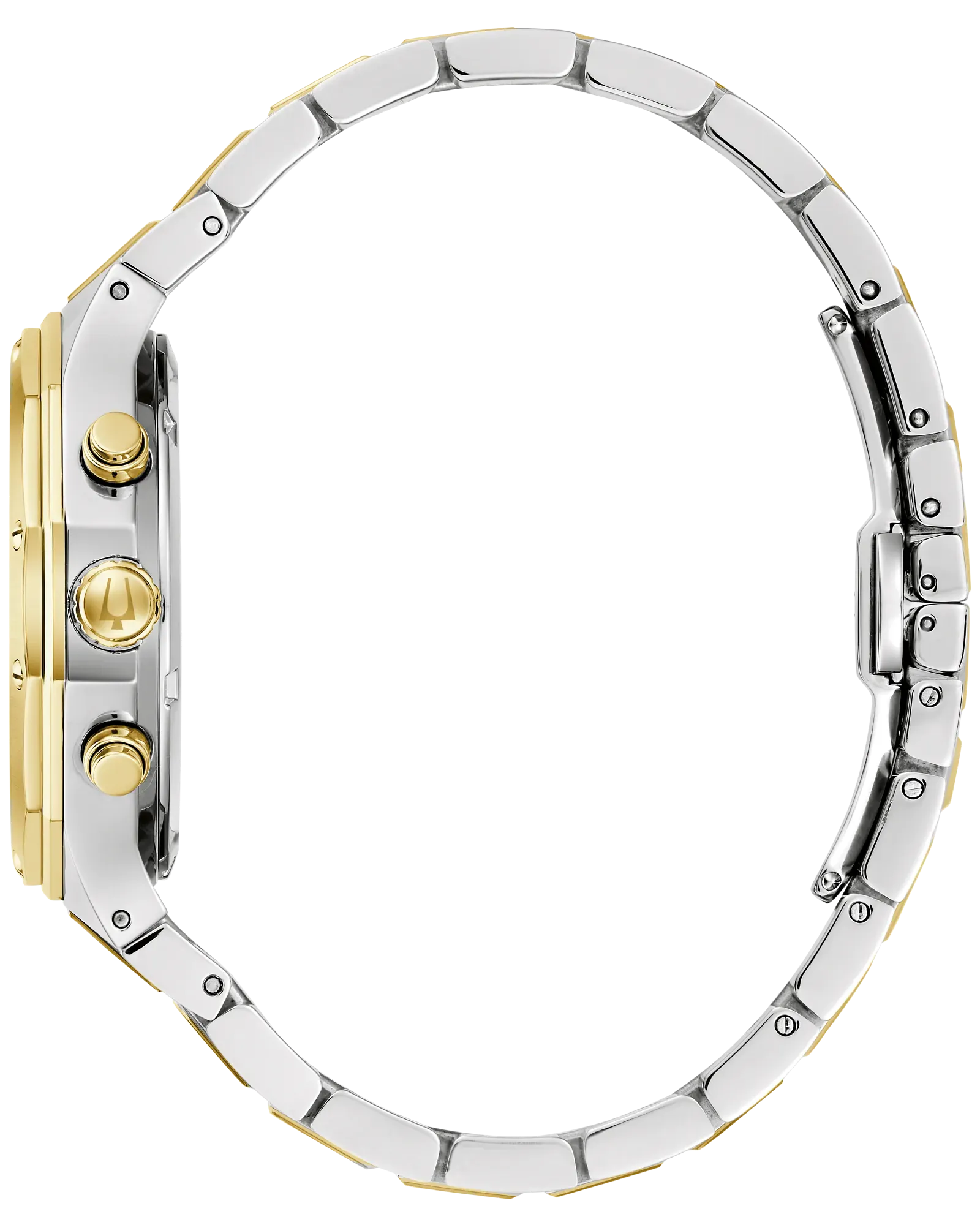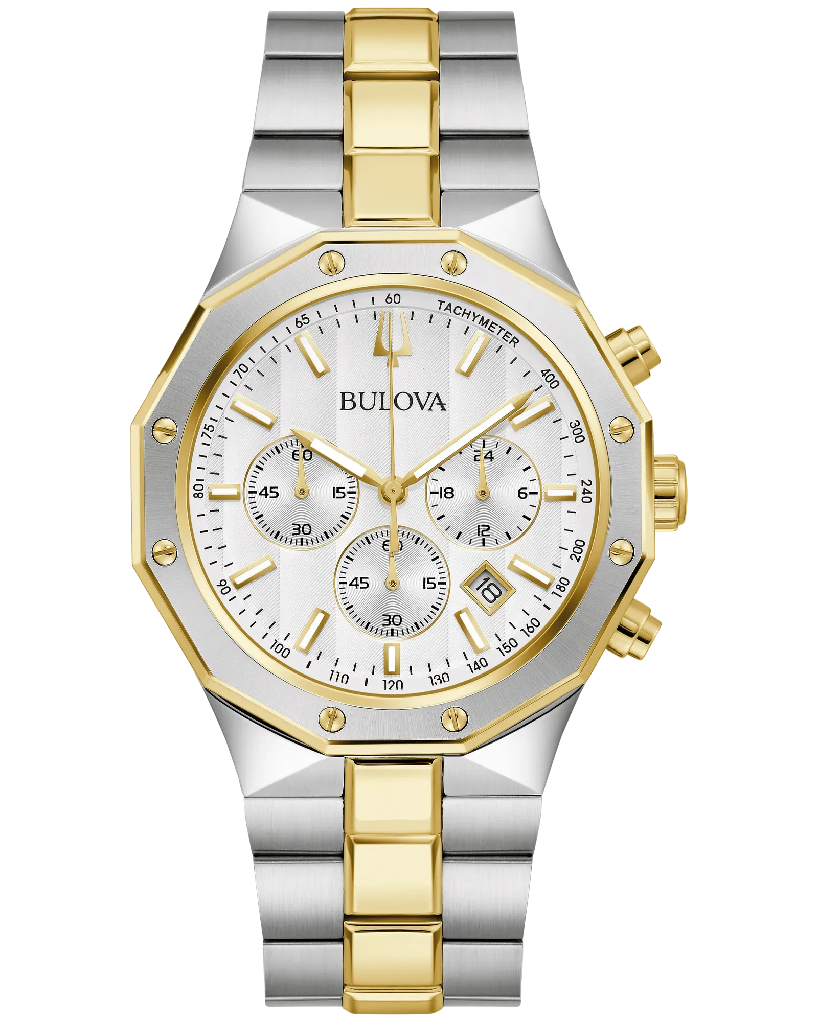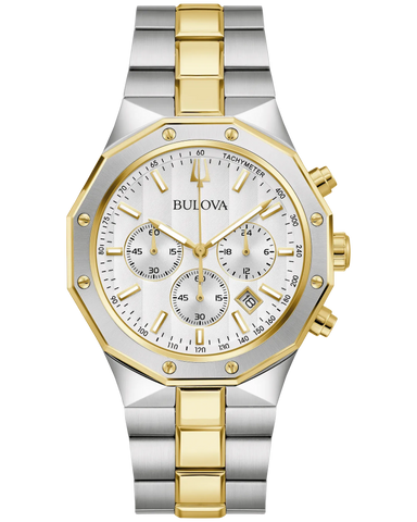 Bold, modern design characterizes this 6-hand chronograph from the Classic Bulova Prestige men’s collection. The watch features a faceted 40mm gold- and silver-tone stainless steel case with a geometric bezel, flat sapphire crystal with anti-reflective coating, 100m of water resistance, and a chamfered 3-link bracelet with a combination of brushed and polished finishes and a push-button deployant closure. The...