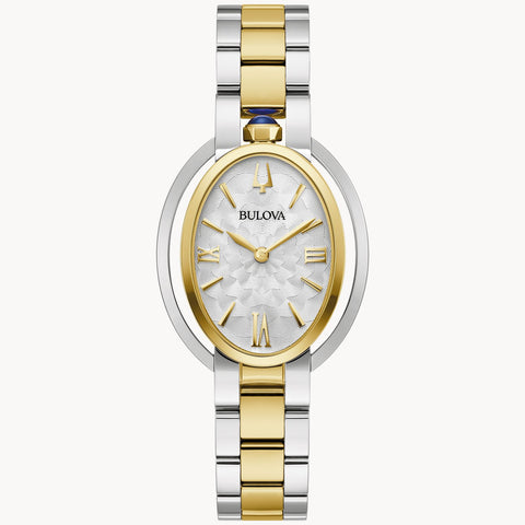 Capturing the uncompromising elegance of the iconic Rubaiyat collection, this Bulova women’s timepiece makes a bold... statement with its unique case and distinctive dial. Fully polished, the oval gold -and silver-tone stainless steel case is accented by sweeping bands that extend from end to end, adding a dynamic presence on the wrist. The gold-tone crown, positioned at 12 o’clock, is...