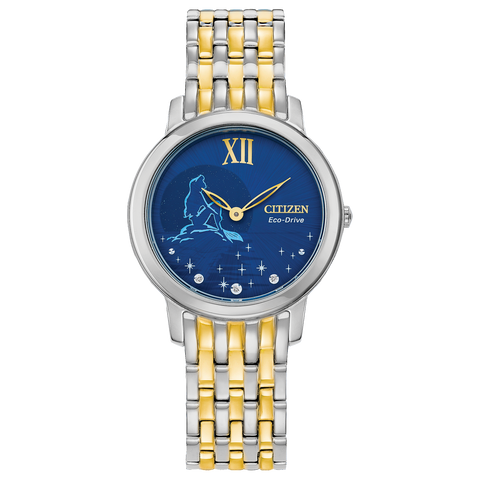 This Citizen watch captures the essence of the Disney Princess who embodies the spirit of forging your own path: Ariel from Disney’s The Little Mermaid. The dark blue dial features the princess herself in a classic silhouette, dreaming of adventures to come. Diamonds round out the dial, designed to add a bit of shimmer to the waves around her. The...