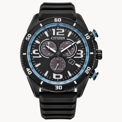 Bold and sporty, this new Brycen chronograph from Citizen is ready for any adventure. The watch wears boldly at 44.8mm, with a black-tone stainless steel case accented with blue details on its racing-style pushers. A rotating 60-minute bezel adds to its functionality, while a durable black silicone strap secures the timepiece to the wrist. On the dial, the sporty styling...