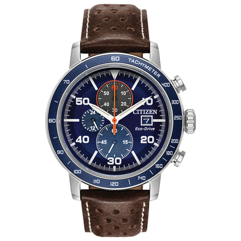 Choose the newly designed CITIZEN Brycen timepiece, with distinguished features sure to stand out on your wrist. This stylish watch in a stainless steel case with blue aluminum plated bezel, chestnut brown leather strap with denim blue dial, features 1/5-second chronograph measuring up to 60 minutes, 12/24-hour time, tachymeter and date. Featuring our Eco-Drive technology – powered by light, any...