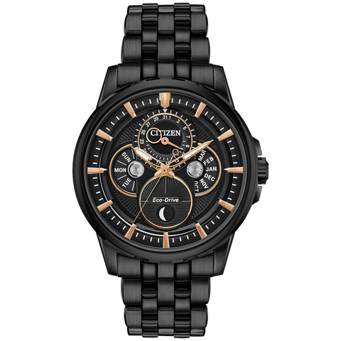 Bring sophistication to your day with the new CITIZEN Calendrier Moonphase, powered by any light with Eco-Drive. This timeless watch features analog month/day/date. Men's watch featured with black ion plated stainless steel case and bracelet with black dial. Featuring our Eco-Drive technology – powered by light, any light. Never needs a battery. Caliber number 8730.