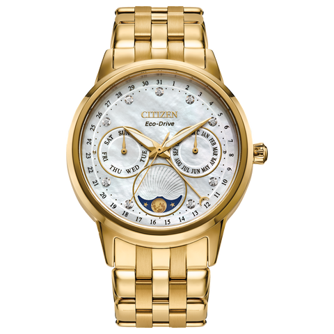 The latest women’s Calendrier timepiece from Citizen arrives with classic charm paired with advanced technology. The gold-tone stainless steel 37mm case features a white mother-of pearl dial inset with nine sparkling diamonds to complete the look of refinement. In addition to the time, this must-have watch also highlights the month, day and date and keeps track of the phases of...