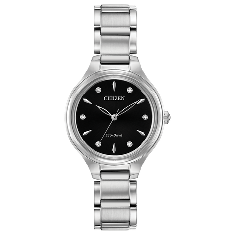 The CITIZEN Corso collection offers a classic, contemporary style for the simple watch wearer. A functional simplicity with a touch of elegance. Featured in stainless steel with a contrasting black dial with diamond accents. Featuring our Eco-Drive technology – powered by light, any light. Never needs a battery. Caliber number J730.