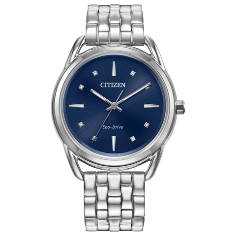 Citizen’s ladies’ Dress Classic watches deliver timeless styling that effortlessly takes you from day to night. Featuring a deep cobalt blue face and sleek silver-tone case and stainless steel bracelet, this watch strikes the perfect balance between bold and traditional. This contemporary watch also features a 3-hand dial, luminous hands and a fold over clasp with push button for easy...