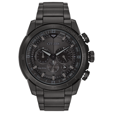 Adventure to new heights with the Citizen Ecosphere. A black on black sleek sporty timepiece featuring a 1/5-second chronograph measuring up to 60 minutes, 12/24-hour time and date. A black ion-plated stainless steel case and bracelet and black dial. Featuring our Eco-Drive technology – powered by light, any light. Never needs a battery. Caliber number B620.