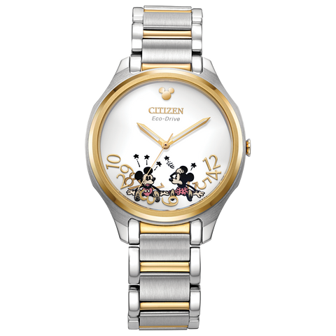 Ever have one of those days? In Citizen’s Disney Mickey & Minnie Mouse watch, the beloved characters have fallen and landed on the bottom of the dial. The famous figures are shown bewildered and holding their heads as they’re surrounded the numbers that have fallen alongside them. The ladies’ watch features a fold-over clasp, two-tone yellow gold and stainless-steel case...