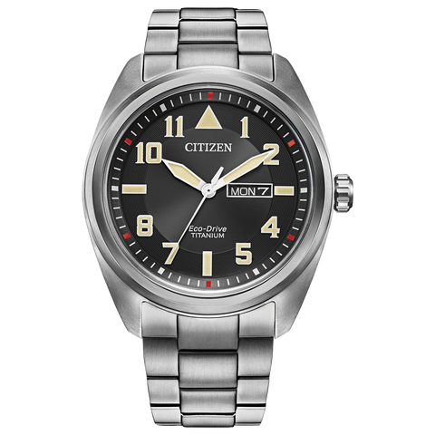 Round out your watch collection with casual styling on an everyday favorite. Citizen’s Garrison features a Super Titanium™ case and bracelet, 12/24 hour time and number date. Featuring our Eco-Drive technology - sustainably powered by light and never needs a battery. Caliber number E101.