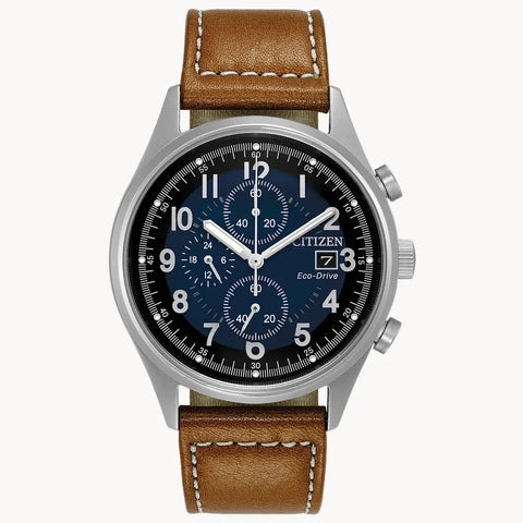 For the every day watch wearer, add a touch of classic refinement to your growing collection with a newly designed Citizen Chandler timepiece. This stylish watch, with stainless steel case, distressed brown strap and iris blue dial, features 1/5-second chronograph measuring up to 60 minutes, 12/24-hour time and date. Featuring our Eco-Drive technology – powered by light, any light. Never...