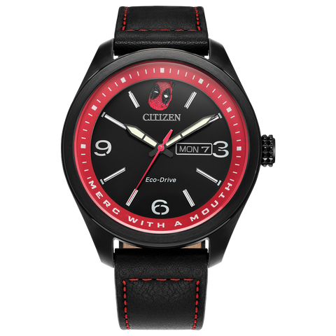 The new Marvel | Citizen Here Comes Deadpool watch breaks the fourth wall with wit and a wink. Its black textured dial features the masked head of Wade Wilson looking directly at you—upside down in the 12 o’clock position. The red dial ring sports the character’s nickname, “Merc With a Mouth,” which is fully illuminated along with his eyes and...