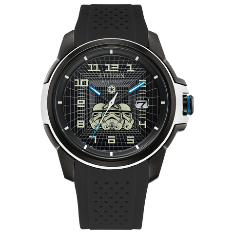 The fearsome power of the Galactic Empire’s elite shock troops is commandingly expressed in the new STAR WARS™ | Citizen Imperial Stormtrooper watch. The dial features three iconic white “buckethead” helmets on a deep black background overlaid with a grid pattern that creates a 3D effect. A special Star Wars inspired font was created for the numeric markers, which are...