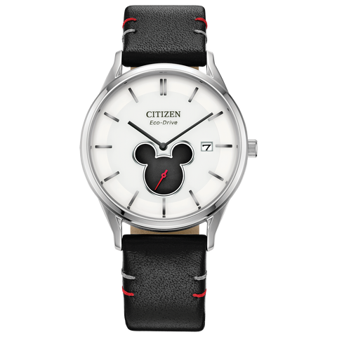 Mickey means business in this elegantly understated blend of form and function from the Citizen Mickey Mouse collection. With its clean, unisex styling, the new Mickey Shadow timepiece will make every day magical and bright. The silver-tone stainless steel case features a silver-white 2-hand dial with date, and a sub dial in the cut-out iconic Mickey Mouse silhouette. The black...