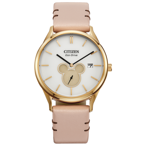 Mickey means business in this elegantly understated blend of form and function from the Disney x Citizen Mickey Mouse collection. With its clean, modern, unisex styling, the new Mickey Shadow timepiece will make every day magical and bright. The gold-tone stainless steel case features an ivory sunray 2-hand dial with date and a sub dial in the cut-out iconic Mickey...