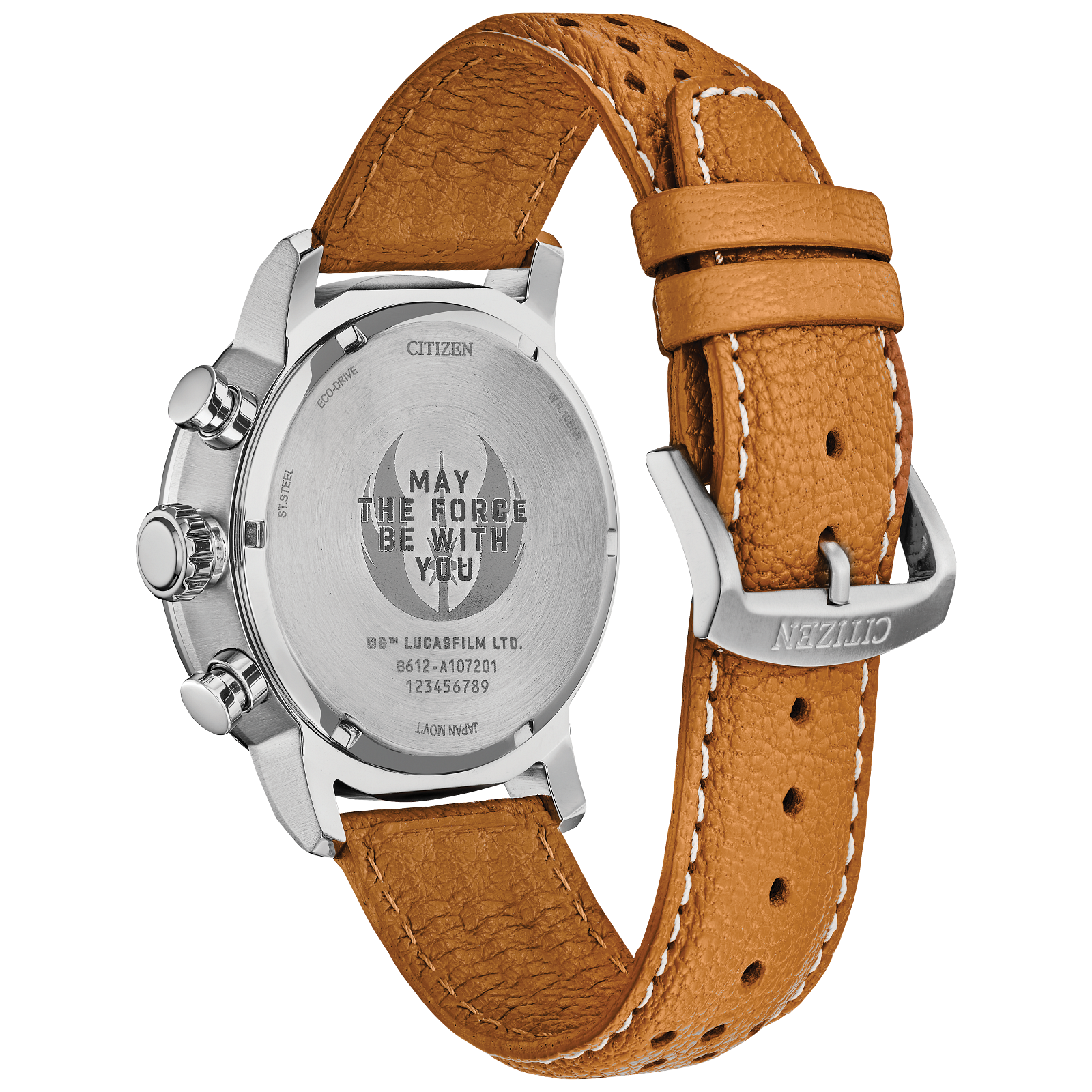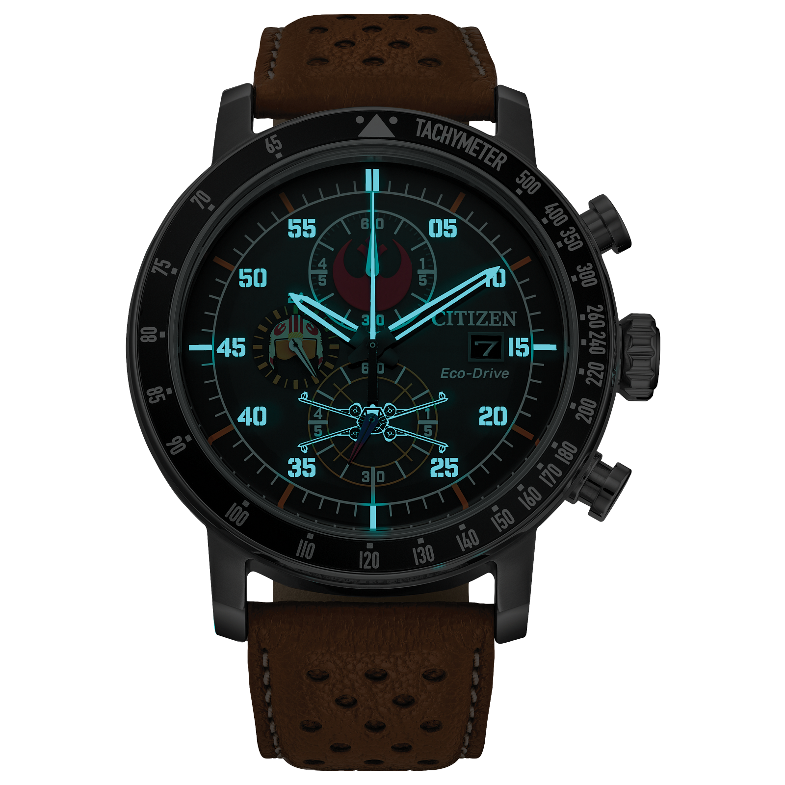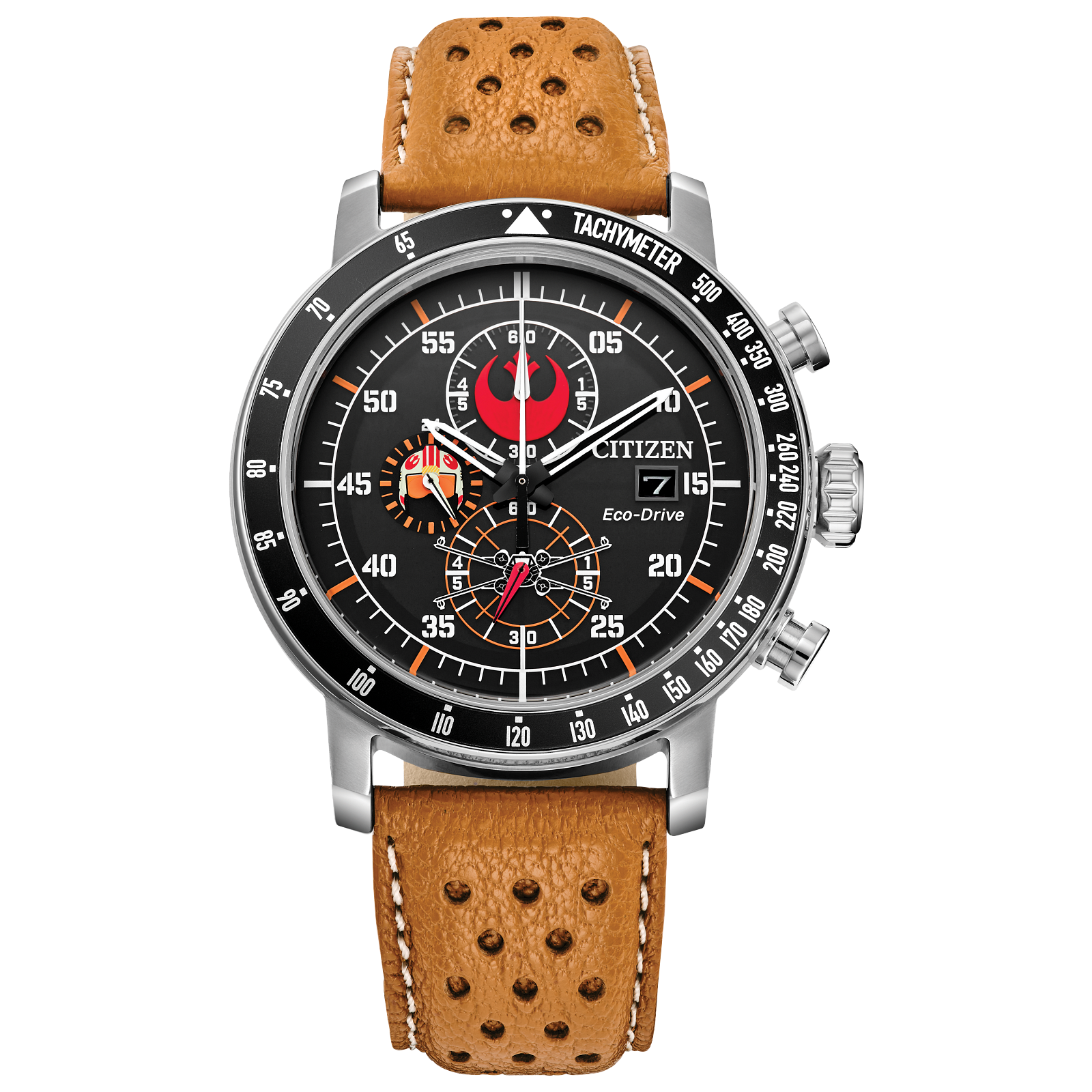 From a long time ago in a galaxy far, far away comes the new men’s watch the Rebel Pilot, from Citizen’s Star Wars™ collection. This timepiece features a 44mm black chronograph dial with 1/5 second chronograph that measures up to 60 minutes, 12/24-hour time, tachymeter and date. The watch dial showcases essential Rebel symbols; the helmet, X-Fighter and the Rebellion...