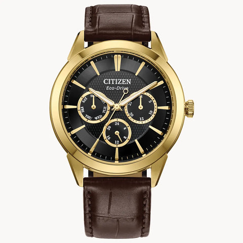 With vintage-inspired style that will never go out-of-date, this latest multi-function Rolan from Citizen takes the classic collection to the next level. The 40mm gold-tone stainless steel case is the perfect base for the watch's black dial, with three sub-dials upon a textured inner sector adding to its distinct appeal. Applied accents and a brown leather strap round out the...