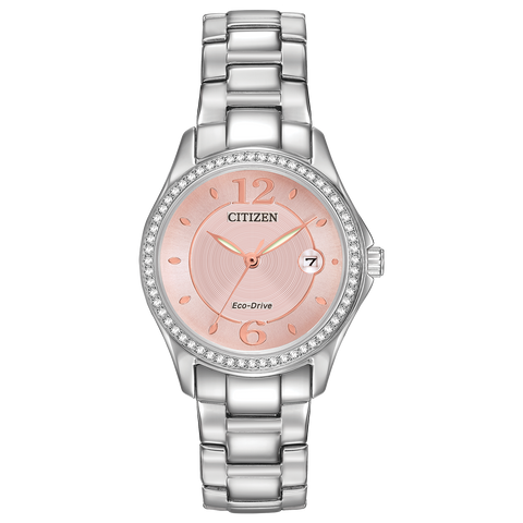 Classic lines and a hint of sophistication allow for this Citizen Silhouette Crystal timepieces to stand out. Shining bright with crystals and featured in a stainless steel case and bracelet with blush pink dial. Includes date feature. Featuring our Eco-Drive technology – powered by light, any light. Never needs a battery. Caliber number J710.
