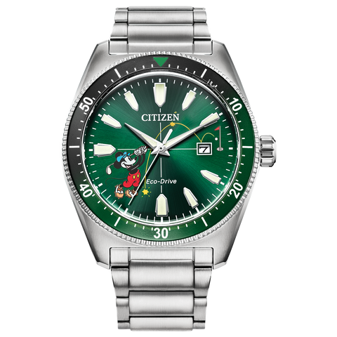 Hit the links sporting the new Tee Time Mickey men’s watch from Citizen’s Disney Mickey Mouse collection. The green, 3-hand dial with date features a dapper Mickey on the golf course about to sink a hole in one. The luminous hands and markers help light up this golfing ace and are complemented with a black and green bezel. A silver-tone...