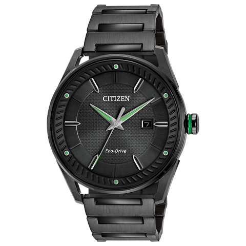 The Drive from Citizen collection. A collection of watches with simple classically modern designed cases all powered by Citizen's Eco Drive Technology. These watches are powered by light and will never need a battery change. Featured here with black ion-plated stainless steel case and black dial with silver-tone and green accents. Featuring our Eco-Drive technology – powered by light, any...