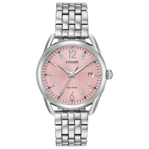 Make room in your watch collection for the new Drive from Citizen timepieces. The LTR timepiece, a fresh staple to your every day watch wearing with clean lines and simplistic detailing. Featured here in a stainless steel case and bracelet, light pink dial and date. Featuring our Eco-Drive technology – powered by light, any light. Never needs a battery. Caliber...