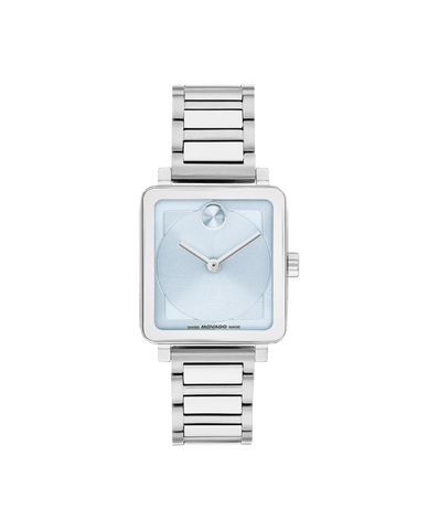 The Bold Evolution 2.0 is defined by an elevated, Bold case and a dimensional micro-textured dial. This 28mm x 26mm square watch features a light blue lacquer dial, slim steel hands, and our signature dot at 12 o'clock.