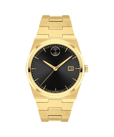 The Bold Quest looks to the future with a shaped case and an integrated bracelet. This 40mm watch features a black sunray dial, yellow goldtone hands, and our signature dot at 12 o'clock.