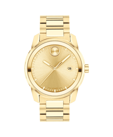 Movado Bold Verso, 42 mm yellow gold ion-plated stainless steel case and bracelet with yellow gold metallization. Features a yellow gold-toned dial, Swiss Super-LumiNova® accents, and date window detailing.