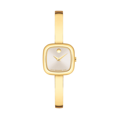 Modern, minimal, and made to stack. The Jewelry-Inspired Movado Museum Bangle. This 21.5mm watch features a cushion champagne sunray dial, yellow gold tone dauphine hands, and our signature dot at 12 o'clock.