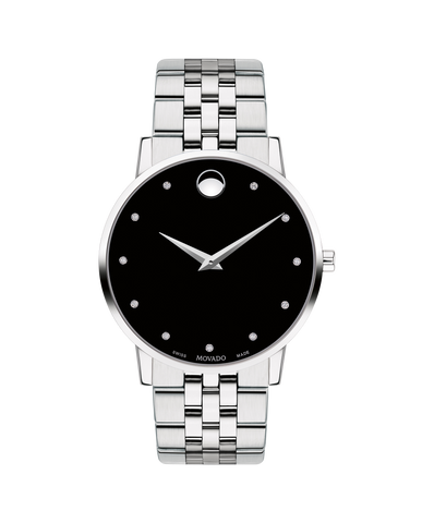 Men's Museum Classic watch, 40 mm stainless steel case, round black dial with 11 diamond markers (0.043 t.c.w.) and silver-toned dot and hands, stainless steel link bracelet with deployment clasp.