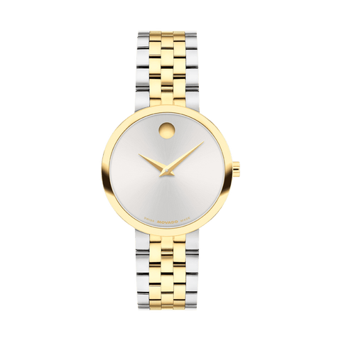 The Museum Classic is the purest interpretation of Movado's Museum Dial—an icon of modern design seen in art institutions around the world. This 29.5mm watch features a silver white sunray dial, yellow gold tone dauphine hands, and our signature dot at 12 o'clock.