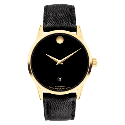 The Museum Classic is the purest interpretation of Movado's Museum Dial—an icon of modern design seen in art institutions around the world. A Swiss made self-winding movement drives this watch, powered by the motion of your wrist. This 40mm two-hand watch features a black lacquer dial, yellow gold tone dauphine hands, and our signature dot at 12 o'clock