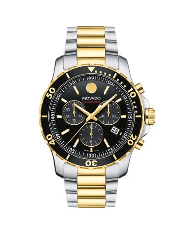 Movado Series 800, 42 mm stainless steel and yellow gold PVD-finished case and bracelet with black chronograph dial.