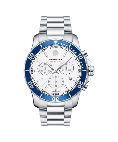 The Series 800 Chronograph is a modern take on a timeless sport-inspired silhouette. This 42mm chronograph watch features a white lacquer dial and a blue aluminum bezel.