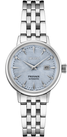 Seiko Presage Cocktail Time. Offering the finest in Japanese mechanical watchmaking, the Presage Collection blends precision technology with superior craftsmanship and design. Inspired by the vibrance of the city's modern lounges, the newest Cocktail Time designs express the excitement of today's Tokyo, with fresh styling and colors. With 8 diamonds adding sparkle to a pale blue dial with pressed pattern...