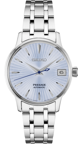 From the Presage Cocktail Time Collection. Offering the finest in Japanese mechanical watchmaking, the Presage Collection blends precision technology with superior craftsmanship and design. Inspired by the delights of a cocktail bar, this sophisticated watch features an ice blue dial with pressed pattern, gloss finish and date calendar. The 23-jewel movement, with manual and automatic winding capability, beats at a...