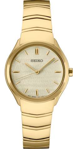 From the Essentials Collection. With sleek sophistication, this distinctively modern watch makes an immediate style statement. The clean, minimalist dial, in light champagne with simple stick markers, features a subtly varying metallic texture for added visual interest, while the soft curves of the bracelet are highlighted by a mirror and hairline finish. In stainless steel with rich gold finish, this...
