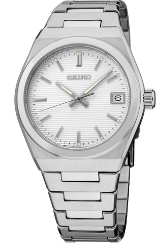 From the Essentials Collection. A modern take on a classic style, this elegant watch features a sleek, angular case and bracelet design perfect for both dress occasions and everyday wear. The silver pressed pattern dial showcases simple silver stick indices for a contemporary feel and includes a date calendar and LumiBrite hands and markers. Crafted of stainless steel with a...