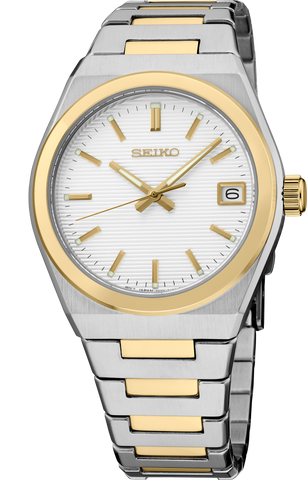 From the Essentials Collection. A modern take on a classic style, this elegant watch features a sleek, angular case and bracelet design perfect for both dress occasions and everyday wear. The white pressed pattern dial showcases simple gold-tone stick indices for a contemporary feel and includes a date calendar and LumiBrite hands and markers. Crafted of stainless steel with a...