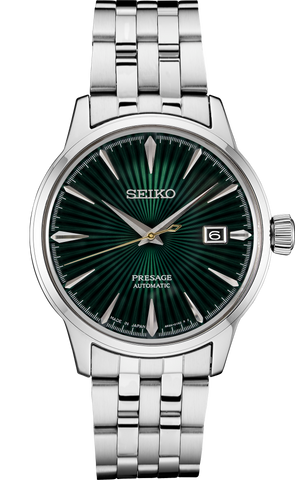 From the Presage Cocktail Time Collection. Offering the finest in Japanese mechanical watchmaking, the Presage Collection blends precision technology with superior craftsmanship and design. Inspired by the delights of a cocktail bar, this sophisticated watch features a green dial with pressed pattern, gloss finish and date calendar. The 23-jewel movement, with manual and automatic winding capability, beats at a frequency...
