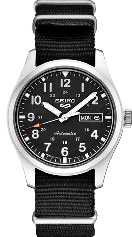 Seiko 5 Sports. Inspired by classic field/military design, this stylishly retro watch offers authentic lines with both durability and all-day excellence. Providing automatic technology that you control with every movement, this versatile watch is powered by a 24-jewel movement that beats at a frequency of 21,600 vibrations per hour, with a power reserve of approximately 41 hours and manual winding...