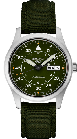 Seiko 5 Sports Collection. Inspired by the vintage designs worn by early pilots, this updated classic offers genuine style with both durability and all-day versatility. Providing automatic technology that you control with every movement, this distinctive watch is powered by a 24-jewel movement that beats at a frequency of 21,600 vibrations per hour, with a power reserve of approximately 41...