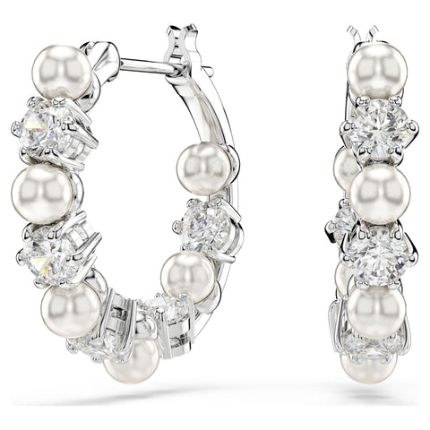 Matrix hoop earrings Crystal pearl, Round cut, White, Rhodium plated 5709256