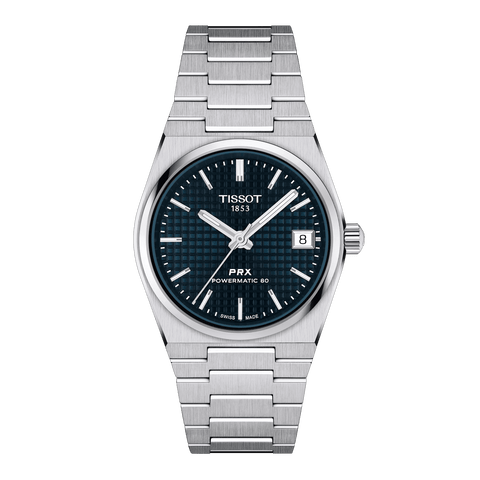 Introducing the Tissot PRX 35mm Powermatic 80, a perfect balance of timeless appeal and modern craftsmanship. This 35mm watch boasts a high-quality steel case and a captivating blue dial, inspired by its renowned 1978 predecessor. The distinctive waffle dial pattern adds an extra layer of elegance to the automatic model. Water-resistant up to 100 meters and featuring a Nivachron™ balance...