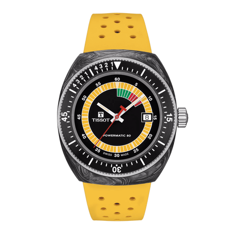 Discover the Tissot Sideral, a captivating fusion of vintage allure and modern craftsmanship. The watch features a 41mm wide forged carbon case and a vibrant yellow strap, paying homage to its iconic 1970s roots. The dial displays a multi-colored luminescent animation, enhancing its unique charm. Water-resistant up to 30 bar (300 meters) and equipped with Super-LumiNova® coated indices, the Sideral...