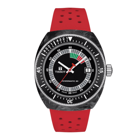 Discover the Tissot Sideral, a captivating fusion of vintage allure and modern craftsmanship. The watch features a 41mm wide forged carbon case and a bold red strap. The dial presents a multi-colored luminescent animation, amplifying its distinct appeal. Water-resistant up to 30 bar (300 meters) and equipped with Super-LumiNova® coated indices, the Sideral is a statement piece for trendsetters and history enthusiasts. Effortlessly modify your look with the interchangeable perforated rubber strap. Make a statement with the Tissot Sideral.