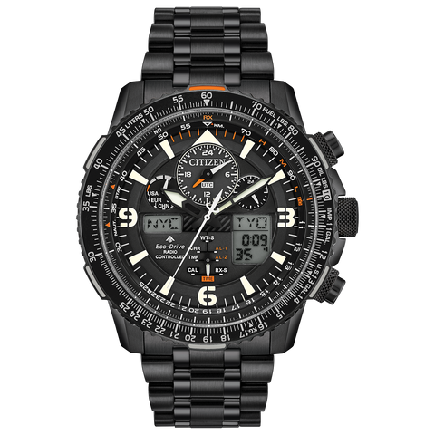 Redefining atomic timekeeping with a turbine inspired bold and powerful timepiece. The newest edition of the CITIZEN Promaster Skyhawk A-T collection is remarkably dynamic and visually appealing. With atomic timekeeping is 43 cities, this chronograph watch features a perpetual calendar, dual time, alarms, countdown timer, digital backlight and UTC displays, power reserve and pilot's rotating slide rule bezel. This model appears with a black ion-plated stainless steel case and bracelet, black dial, bright orange details and black bezel with unique case and dial motifs. Featuring our Eco-Drive technology – powered by light, any light. Never needs a battery. Caliber number U680.