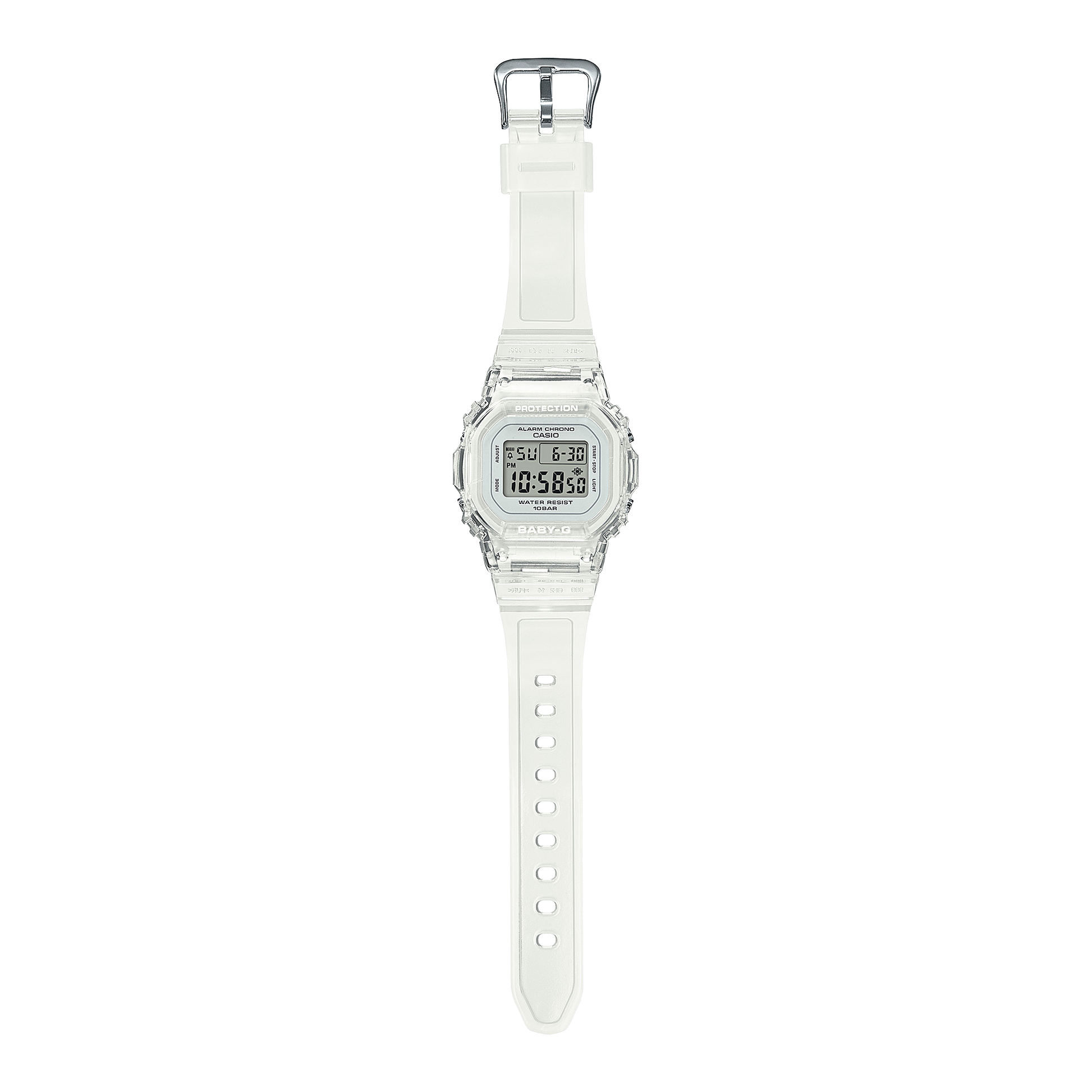The classic BABY-G square look you love — now in an even slimmer, more compact design. The smaller BGD-565 case is 2.6mm shorter, 2.1mm narrower, and 1.2mm slimmer than its predecessor and is designed to appear flat when viewed from the side for an even thinner look. In icy translucent clear to match any fashion statement you choose.