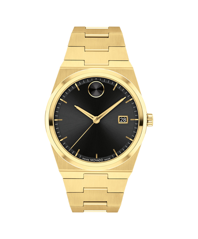 The Bold Quest looks to the future with a shaped case and an integrated bracelet. This 40mm watch features a black sunray dial, yellow goldtone hands, and our signature dot at 12 o'clock.